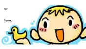 A bathing boy plays with a rubber duck on this printable gift tag for a baby shower.