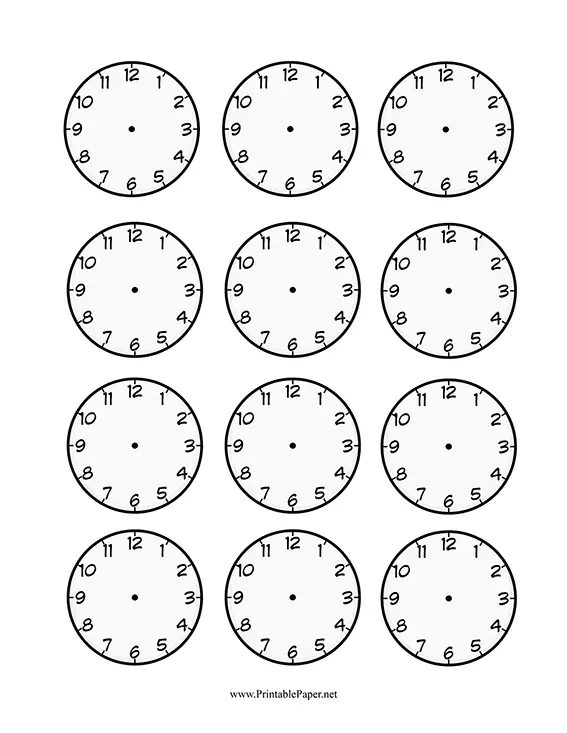 A set of 12 printable, labeled clock faces for a variety of crafting and other projects. Each is approximately 2 inches in size.