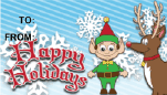 This colorful Christmas gift tag wishes the recipient Happy Holidays and features a Santa's elf and reindeer and snowflakes.
