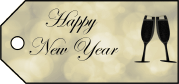 Champagne glasses are raised in a toast against a background of golden bubbly in these printable New Year gift tags.