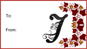 Drawn in flowing, cursive script, the letter J decorates this free, printable monogram gift tag. Users can fill in the "to" and "from" sections and attach them to presents.