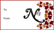 Ten gift tags on a fall leaf background decorate this free printable that features the letter N in beautiful script. Great for Christmas and birthday presents, it offers a "to" and "from" space as well.