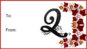 Drawn in flowing, cursive script, the letter Q decorates this free, printable monogram gift tag. Users can fill in the "to" and "from" sections and attach them to presents.