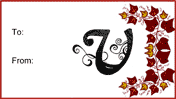 Perfect for Christmas, birthdays, holidays and parties, these free, printable monogram gift tags feature the letter V in cursive scrollwork on a fall leaf background.