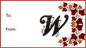 A cursive letter W decorates each of these free, printable gift tags with a fall leaf background. Users can fill in the recipient and sender names and attach them to presents.