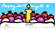 A birthday candle emerges from a fruit-topped cake on this Happy Birthday gift tag.