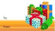 Colorful wrapped Christmas gifts decorate this bright holiday gift tag.