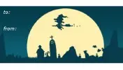 A witch flies off on her broom on Halloween night on this graveyard-themed Halloween gift tag.