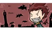 A creepy kid vampire bares his Dracula teeth as bats fly around a graveyard on this printable Halloween gift tag.