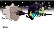 A creepy cartoon witch rides her broom on this printable Halloween gift tag.