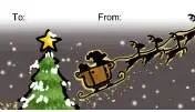 Santa guides his reindeer-pulled sleigh into the night sky with a star-topped Christmas tree in the background on this printable gift tag.