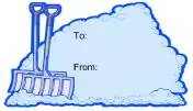Snow shovels rest beside a pile of snow on this printable gift tag, great for any winter holiday gift.