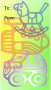 A rocking horse, plane, and toy car illustrate this printable gift tag for child or baby presents.