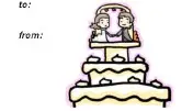A happy cartoon married couple tops a wedding cake on this printable gift tag.